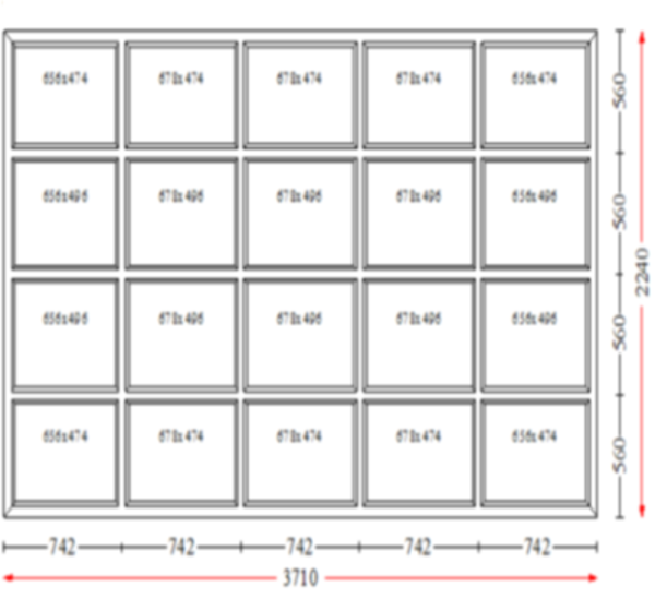 - 5 vaks met 20 afzonderlijke ramen volgens tekening